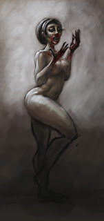 Here’s a spontaneous doodle that I put together in about two hours tonight, as a distraction from other stuff I should be doing. I started it as a straight-to-Photoshop sketch on a toned background, using a layer of black lines and a layer of highlights/washes. Flattened after a while, then used some color overlays to bring the figure forward more, and a chalky halo to push her further out.