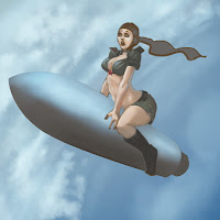 After that, I started refining the anatomy and adding some preliminary color. (Fig. 3) This can be a tough stage, trying to get some colors that work together, but in this case it seemed pretty simple: I knew I wanted a military green for her clothes, with some red accents, and a sky background. I also trimmed her badonk a bit, because it was looking just too massive. I also made her arms straighter, increasing the tension of the pose. I found this helped make her look like she is trying to hang on, rather than just riding the rocket.