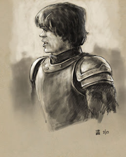 In anticipation of the new season, I’ve been re-watching Game of Thrones. Here’s a little sketchy-sketch of Peter Dinklege as Tyrion, in armor, taken from a screen grab.