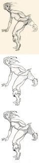Once the basic lines were in place, I laid in some of the main shadow masses. I like to build up my shadows and my lights throughout the process, so at this stage they are still very faint.