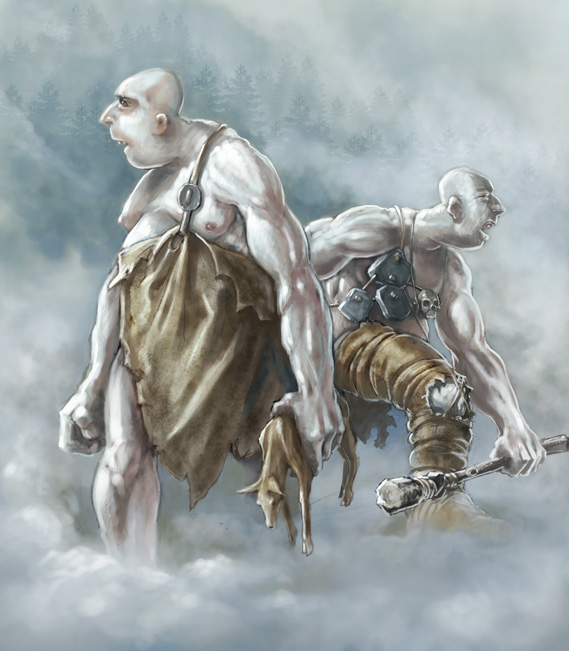 These guys are Fog Giants, which are really stupid and very primitive giants. I liked the idea of making them look like inbreds, so I gave them small craniums and gawping mouths. I also tried to keep the color scheme very cool to underscore the foggy, damp environment.